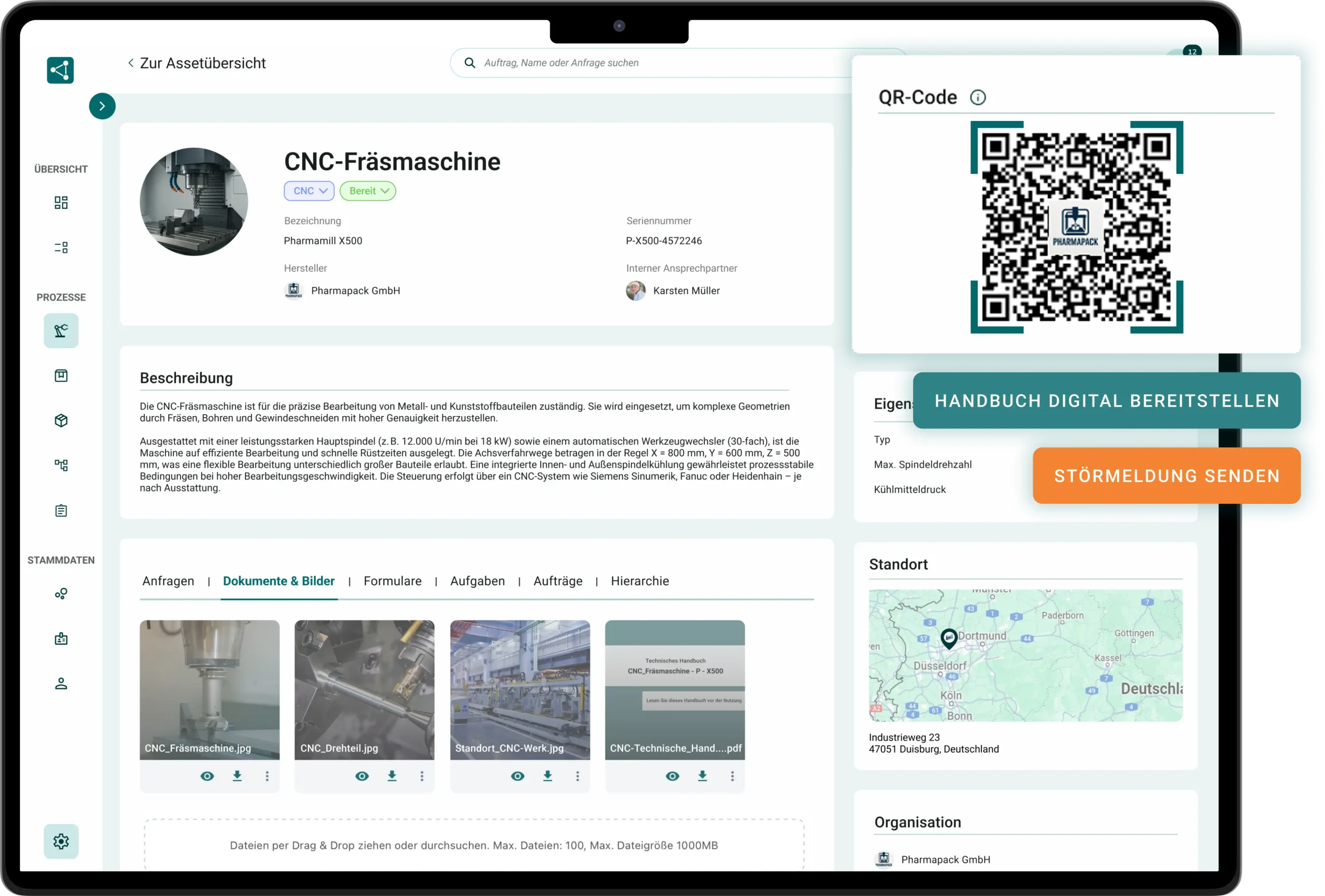 Behalte jederzeit den Überblick über deine Maschinen, Anlagen und deren Wartungshistorie. Per QR- oder NFC-Tag greifst du direkt an der Anlage auf technische Dokumentationen und Ansprechpartner zu.